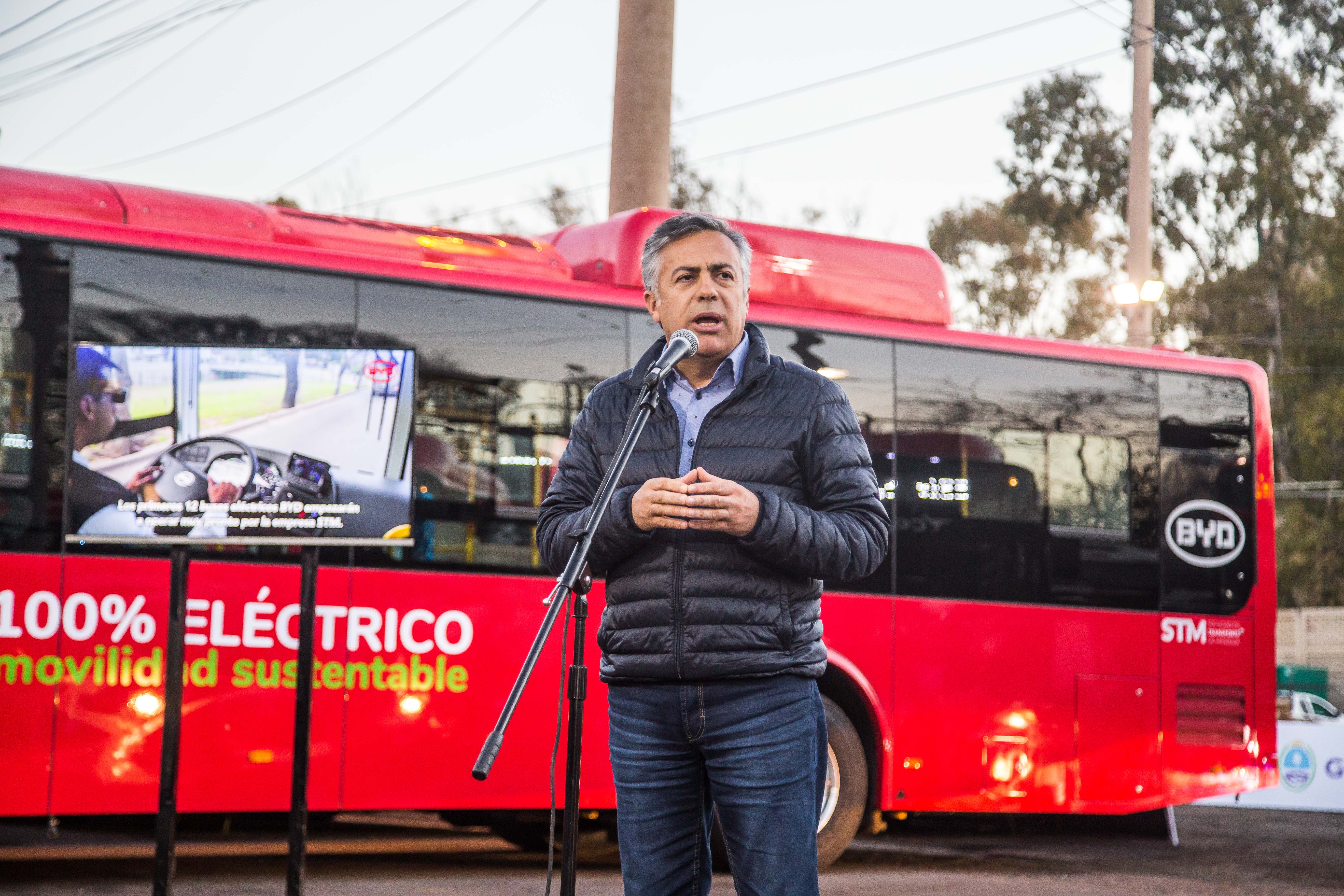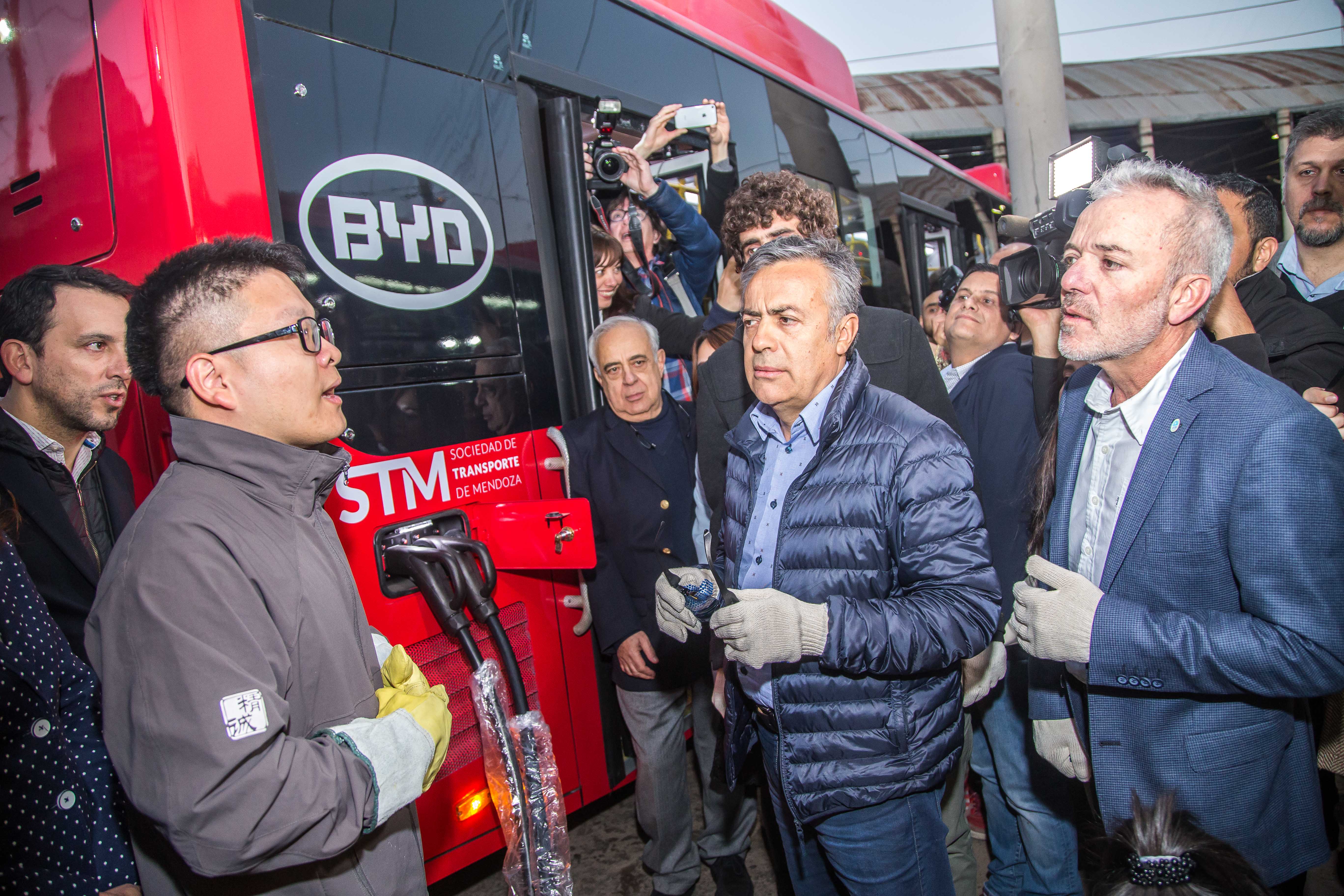 La ceremonia fue encabezada por el Gobernador de Mendoza, Alfredo Cornejo, junto al secretario de Servicios Públicos, Natalio Mema, y directivos de la Sociedad de Transporte de Mendoza (STM) quienes presentaron la nueva flota de buses eléctricos que se suma desde el próximo lunes al sistema de transporte público. También estuvieron el presidente de la Sociedad, de Transporte de Mendoza (STM), Leopoldo Cairone; el ministro de Gobierno, Trabajo y Justicia, Lisandro Nieri; el secretario de Ambiente y Ordenamiento Territorial, Humberto Mingorance; la titular del Emetur, Gabriela Testa; el intendente de Godoy Cruz, Tadeo García Zalazar y la Country Manager de BYD Argentina, Audrey Li.