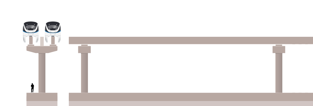 “SkyRail carbodies are 10’5” / 3.16 m wide, about the same width as a subway car. However, the vehicles are lightweight, about 2/3rd the weight of a light rail vehicle, which means the structure needed to support SkyRail is substantially lighter as well. Our structural engineers estimate that SkyRail structure require only about half the steel and concrete as elevated rail structures.