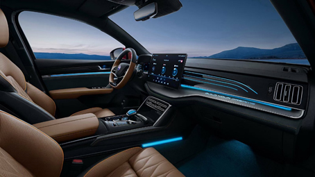 Su interior ha tenido una importante actualización, con todos los asientos tapizados en cuero marrón y costuras tipo waffle, ofreciendo calidad y exclusividad. Los asientos del conductor y del copiloto cuentan con calefacción y ventilación para brindar una experiencia de lujo en la parte delantera de la cabina. También en la parte delantera, una gran pantalla de información y entretenimiento se puede girar en formato horizontal o vertical para adaptarse a los requerimientos específicos de los pasajeros y otros dispositivos.