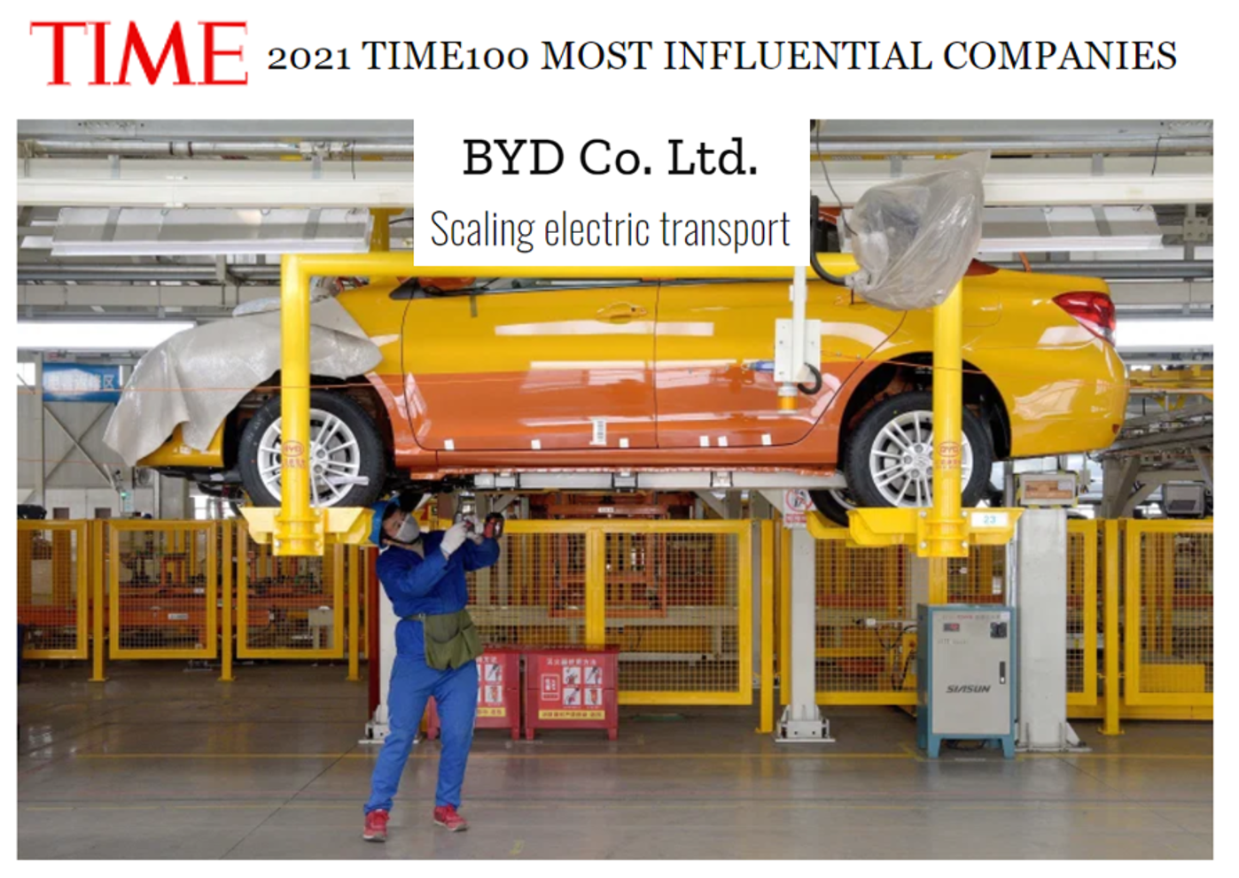 Bajo el título “Escalando el Transporte Eléctrico”, TIME reconoció el liderazgo de BYD en la fabricación de buses eléctricos de baterías y citó la "aceleración" del negocio de vehículos eléctricos de pasajeros de BYD, incluida la popularidad de su nuevo sedán de lujo, el BYD Han. El artículo también mencionó los avances de la compañía en EE.UU. y Europa, así como también la asociación para construir la primera línea de bucle de buses 100% eléctricos en Japón.