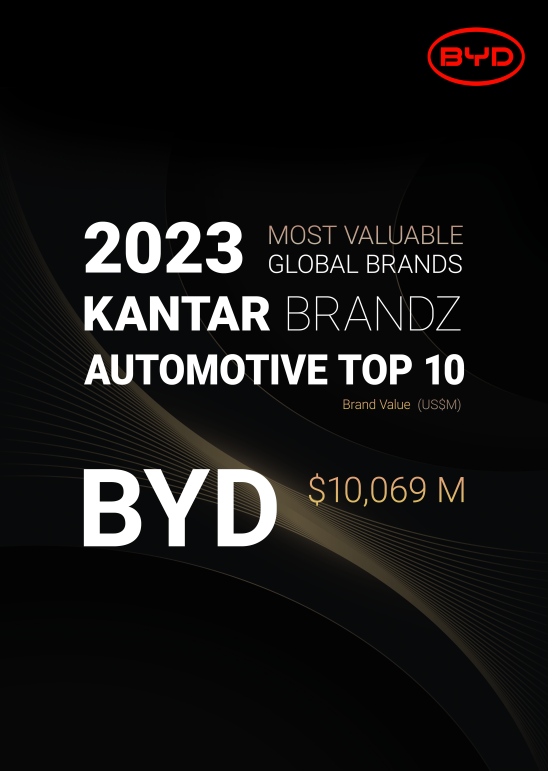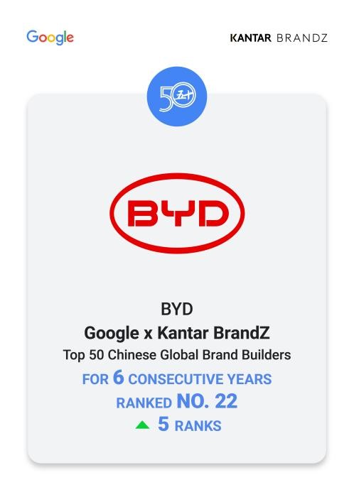 El 15 de junio, Google x Kantar reveló que BYD ocupa el Nº 22 en su lista anual BrandZ Top 50 Chinese Global Brand Builders, con el objetivo de evaluar el progreso internacional de las marcas chinas en diversos sectores. BYD subió cinco puestos en la lista en comparación con el año pasado, habiendo entrado en la lista por sexta vez desde su creación en 2017.