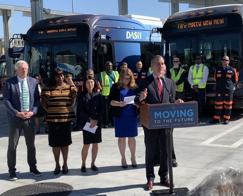 Garcetti hizo el anuncio en el nuevo patio de mantenimiento de buses del Departamento de Transporte de Los Ángeles. La instalación de tres acres cuenta con paneles solares e infraestructura de carga para vehículos eléctricos y puede albergar hasta 70 buses a la vez.